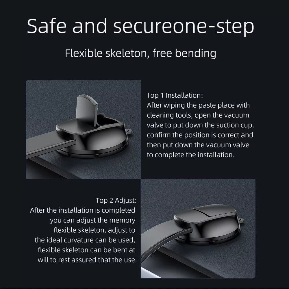 Szabadon állítható mágneses autós tartó – a rugalmas kar megjegyzi az Ön által beállított pozíciót, sima és kényelmes utazást biztosítva. Háromféle módon rögzíthető: a szélvédőre, műszerfalra vagy szellőzőnyílásra. A tartó lehetővé teszi az okostelefon kényelmes és biztonságos használatát vezetés közben.