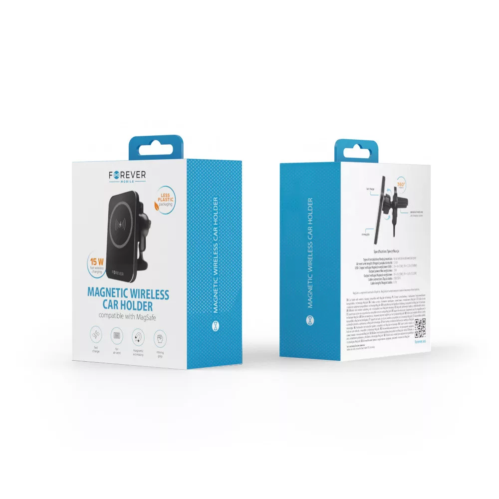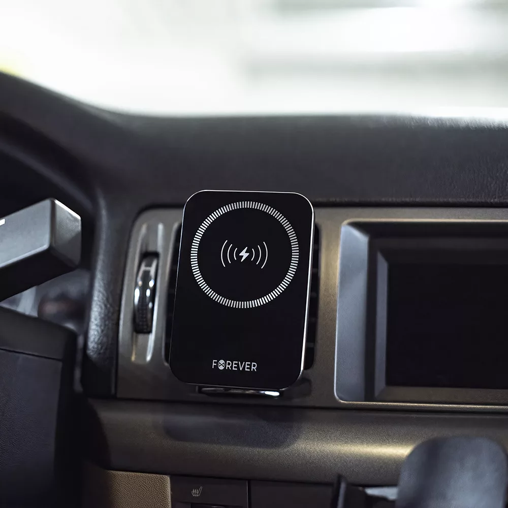 A Forever MACH-100 modern, praktikus és megbízható autós tartó, amely erős mágneses rögzítéssel tartja stabilan a készüléket, miközben 15W teljesítményű vezeték nélküli gyorstöltést biztosít. MagSafe kompatibilis kialakításának köszönhetően tökéletesen illeszkedik MagSafe-es iPhone modellekhez, de Qi töltést támogató készülékekkel is használható.