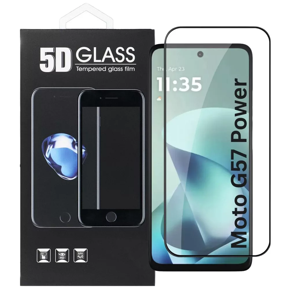 Prémium minőségű 5D edzett üvegfólia Motorola Moto G57 5G, Motorola Moto G57 Power 5G és Motorola Moto G67 Power 5G készülékekhez. Teljes kijelzős, fekete keretes kialakítás, karc- és ütésálló védelem, kristálytiszta kijelzőélmény.