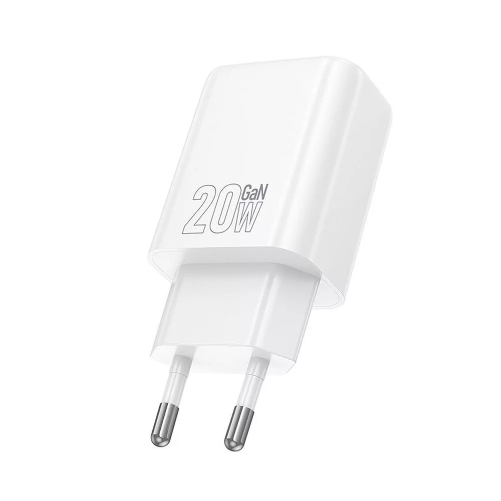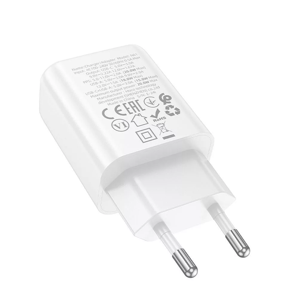 Hálózati töltőfej, adapter, gyorstöltő, USB-C + USB port, fehér, PD + QC 20W, Hoco N61