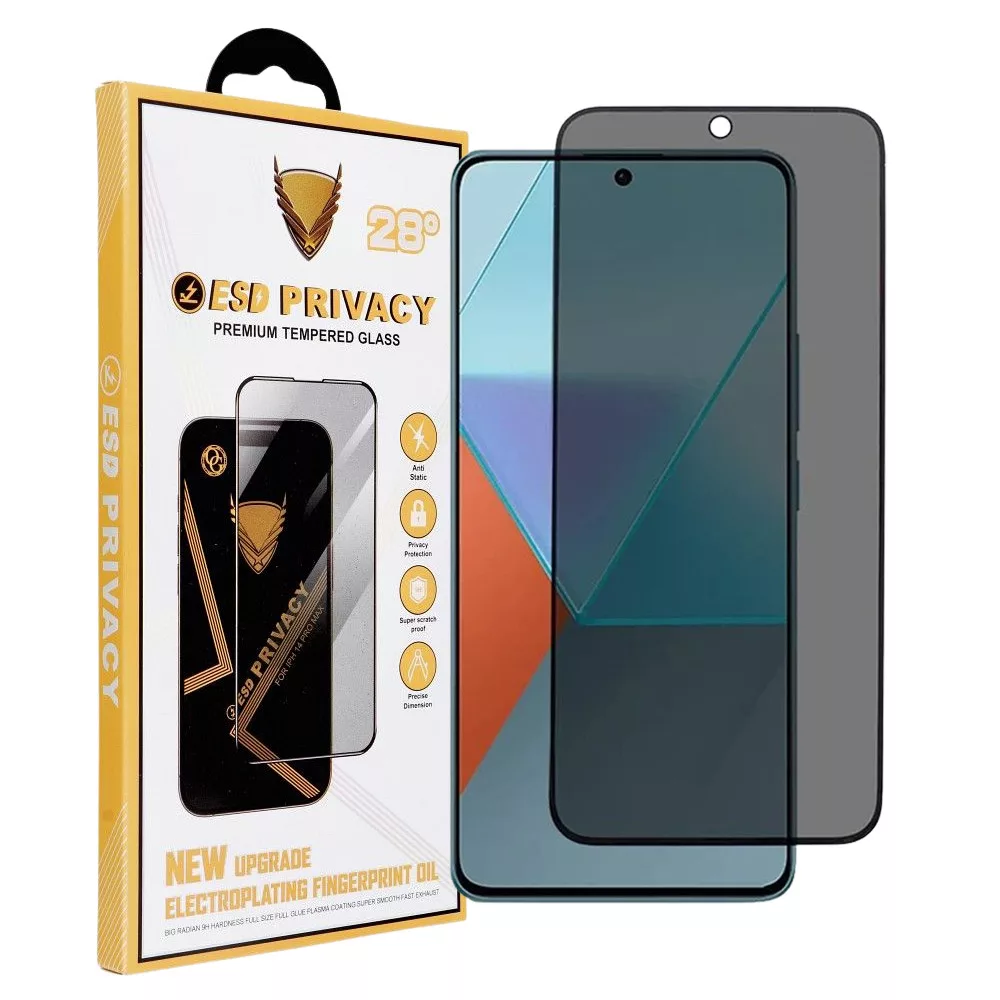 OG Prémium privacy edzett üvegfólia Xiaomi Redmi Note 13 Pro 4G, Xiaomi Redmi Note 13 Pro 5G, Poco M6 Pro 4G és Poco X6 Pro 5G készülékekhez. A 9H keménységű, fekete keretes, betekintés elleni védelemmel ellátott kialakítás megóvja a kijelzőt a karcoktól, miközben oldalról nézve elsötétíti a képernyőt.